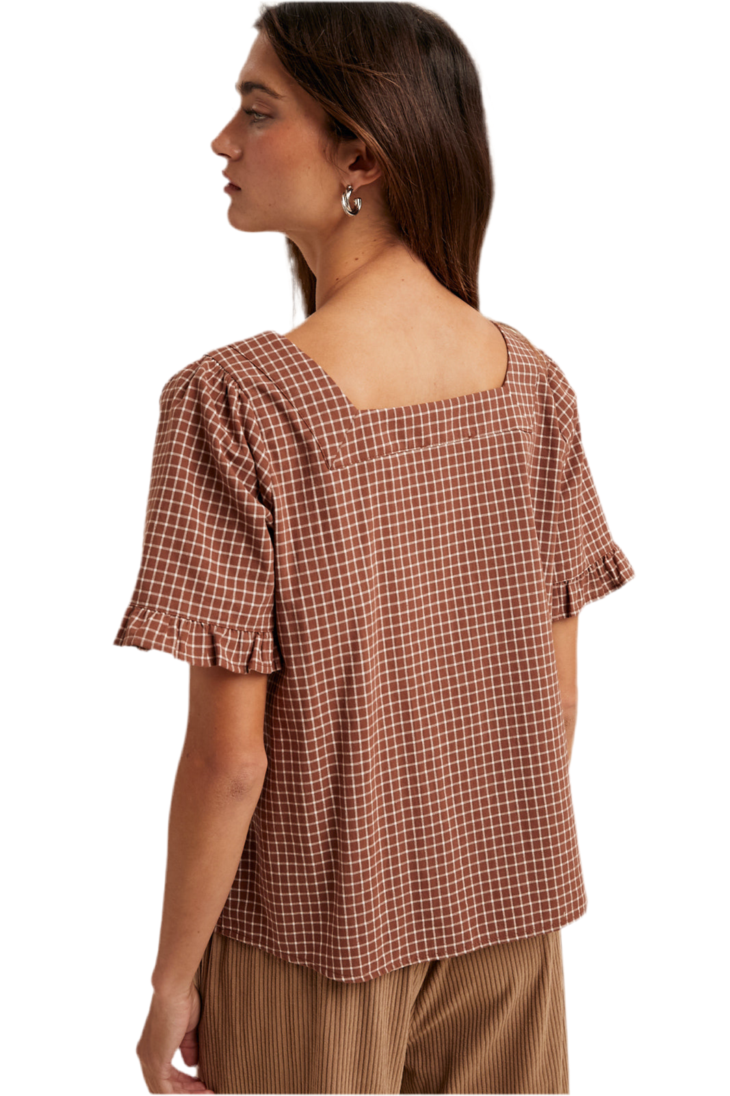 The Betty Short Sleeve Plaid Button-Up Top combines classic style with breathable comfort. Crafted from 100% cotton, this brown and cream plaid shirt offers a soft, natural feel ideal for all-day wear. Its short sleeves and button-up design provide a versatile look suitable for both casual and polished outfits, making it a reliable addition to any wardrobe.