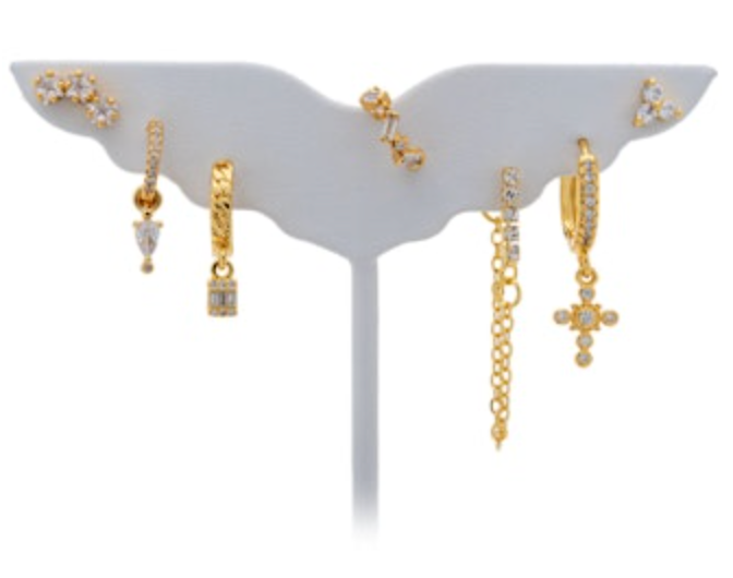 Elevate your accessory collection with the Bracha London Earring Stud Set, featuring seven versatile pieces crafted from gold-tone metal and adorned with clear crystals. This curated set includes studs, huggies, hoops, and a cuff, each designed with secure post-back or hinge closures for comfortable, reliable wear. Perfect for mixing and matching, these earrings offer sophisticated sparkle and style suitable for both everyday elegance and special occasions.