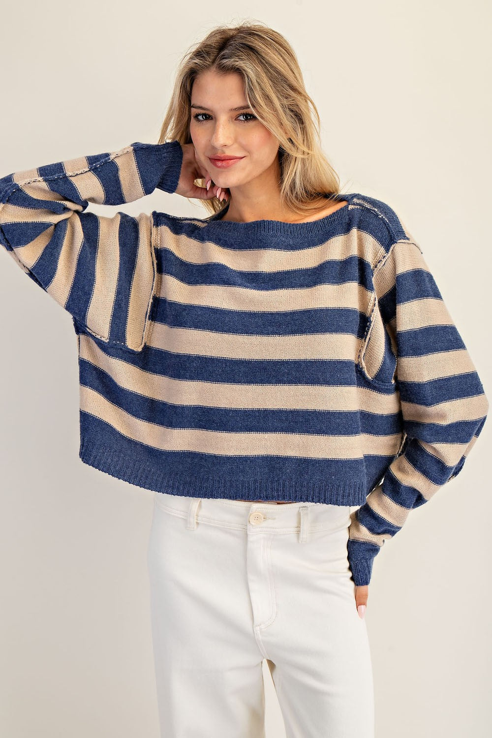 Elevate your casual wardrobe with the Brenda Striped Boat Neck Cropped Sweater. This knit sweater showcases a refined drop shoulder design with dolman sleeves, complemented by exposed seam details and a graceful boat neckline. Finished with ribbed trim, it offers effortless sophistication and a relaxed fit perfect for everyday elegance.