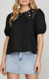 Chelsey Puff Sleeve Embroidery Button Down Blouse