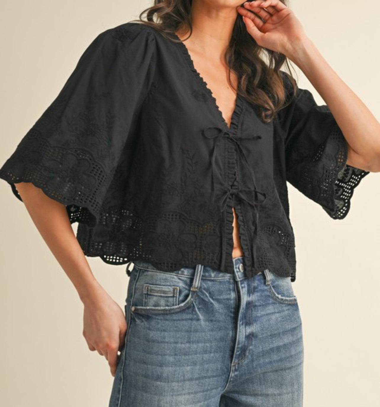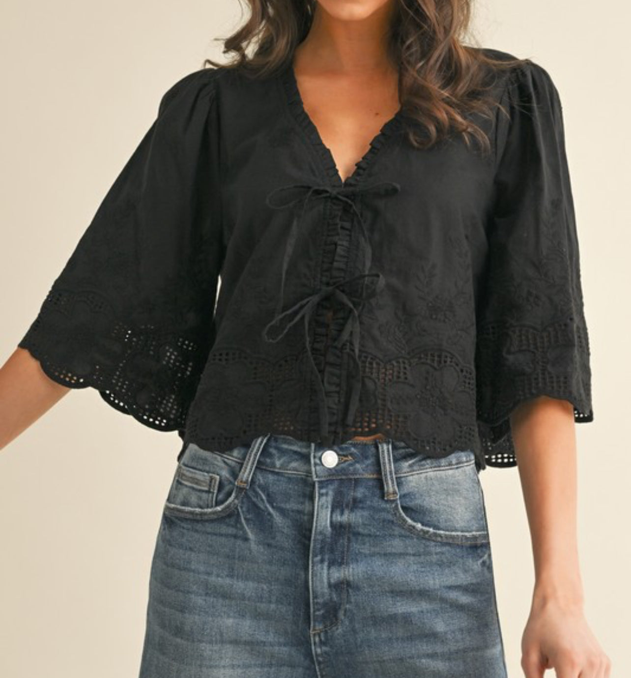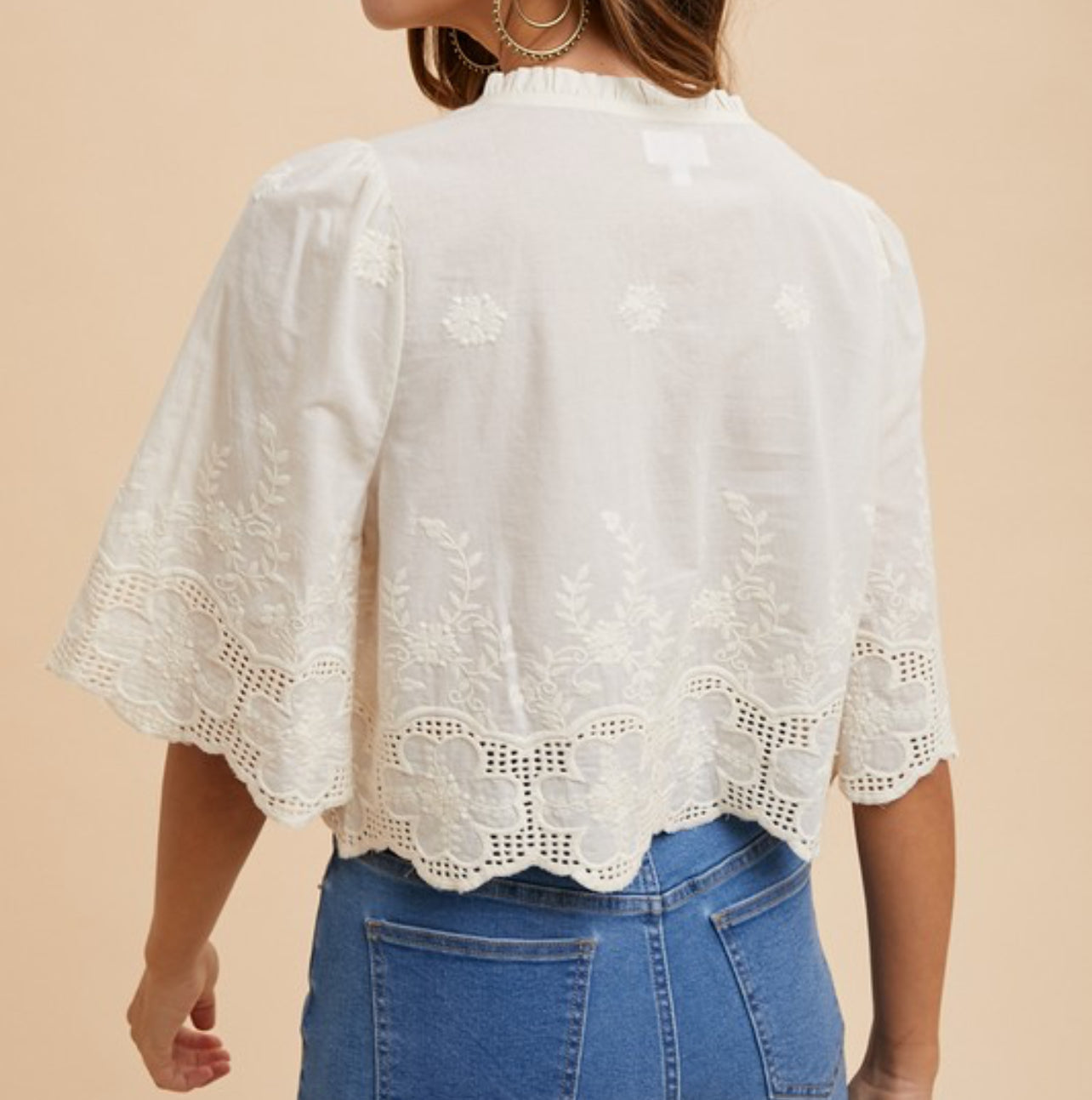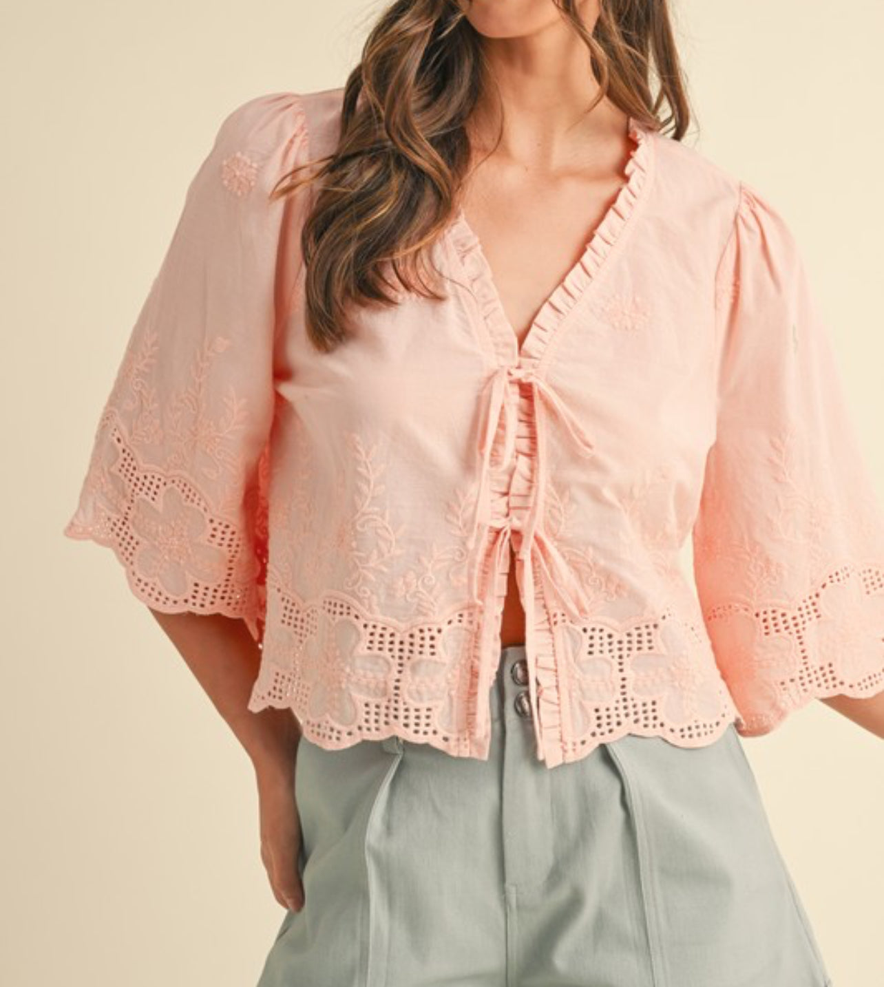 The Emma Floral Embroidery Tie Front Top features a delicate floral embroidery that adds a feminine touch. With a unique scallop edge and tie front design, this top is perfect for dressing up or down. The 3/4 flutter sleeves add a playful touch to this 100% cotton blouse.