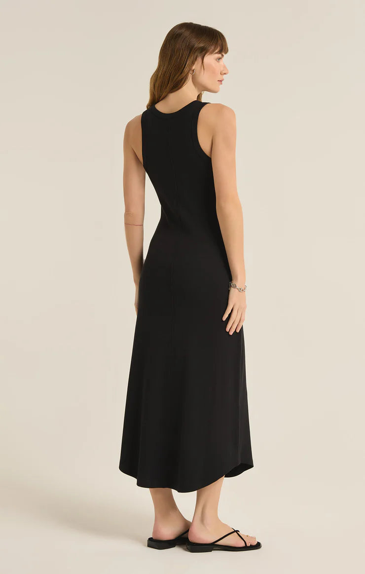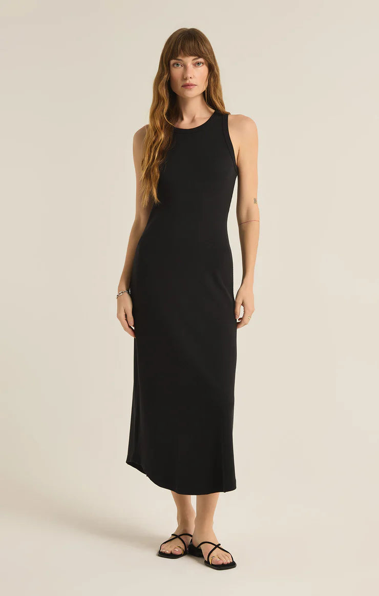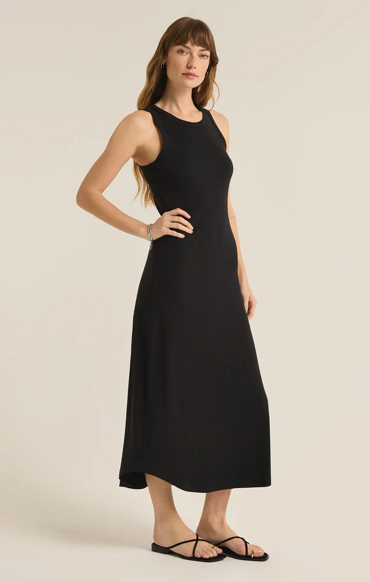 Discover effortless style with the Goodwin Midi Dress. Crafted from soft, midweight cotton modal rib fabric, this sleeveless dress offers ultimate comfort and a flattering, body-skimming fit. Perfect for any occasion, its fuller skirt and curved hem add a modern touch to easy dressing.