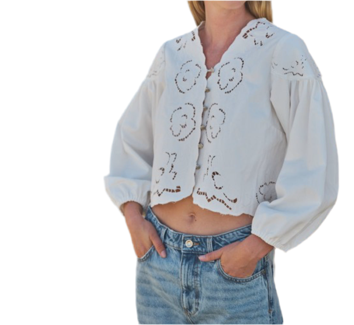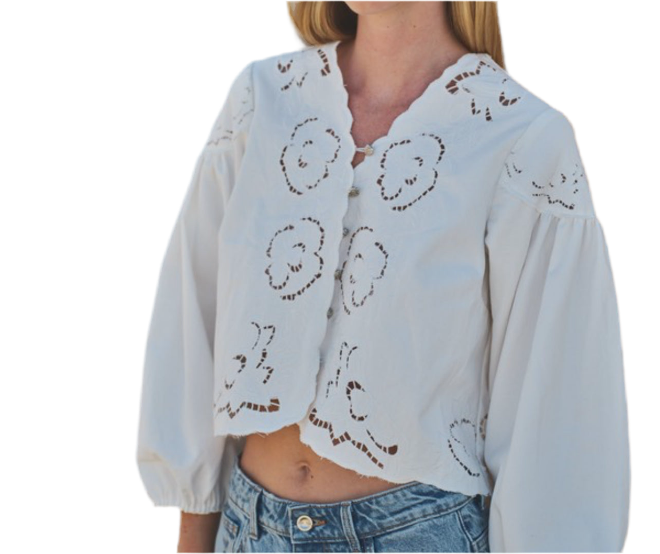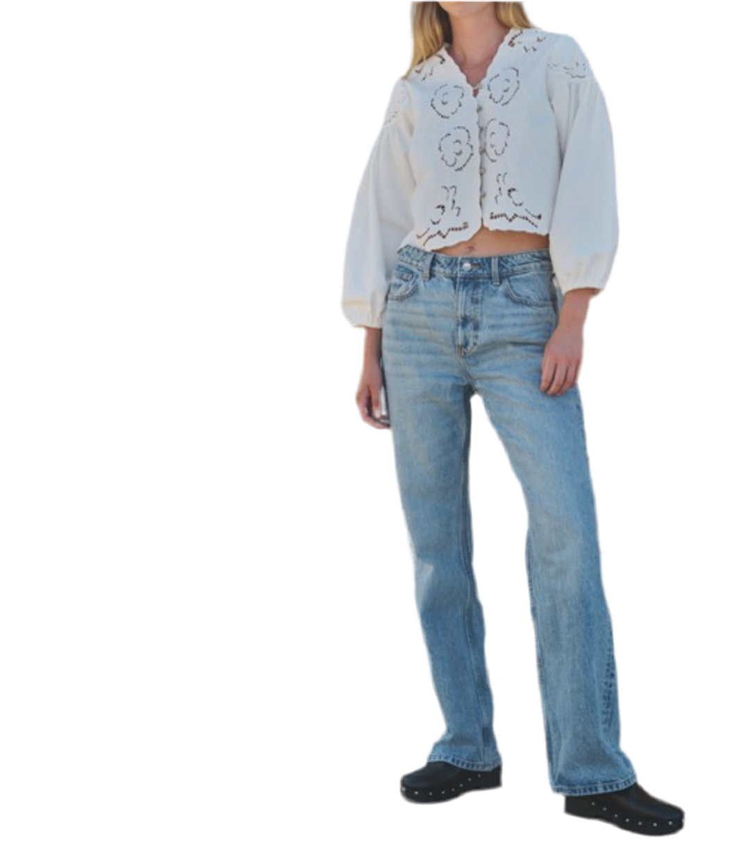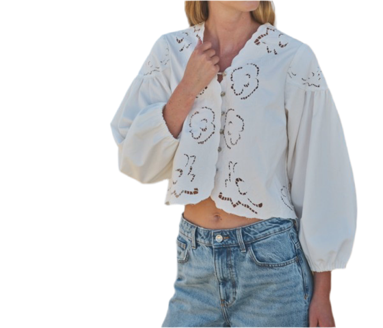 Elevate your casual wardrobe with our Jenna Off White Embroidery Volume Sleeve Top! This light-wash denim beauty combines country charm with fashion-forward flair. The whimsical floral embroidery and peek-a-boo cutouts add a playful twist, while the balloon sleeves bring the drama! Button it up for brunch or leave it open over a tank for festival vibes. Who said denim can't be fun?