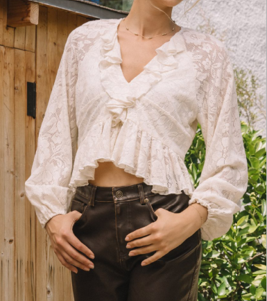 Elevate your look with the Lee Long Sleeve Lace Top, featuring a delicate ruffle V-neck that adds a touch of feminine elegance. The intricate lace design enhances your style while offering lightweight comfort, perfect for both casual outings and special occasions. This top effortlessly combines sophistication with a flattering fit to make you feel confident and chic all day long.