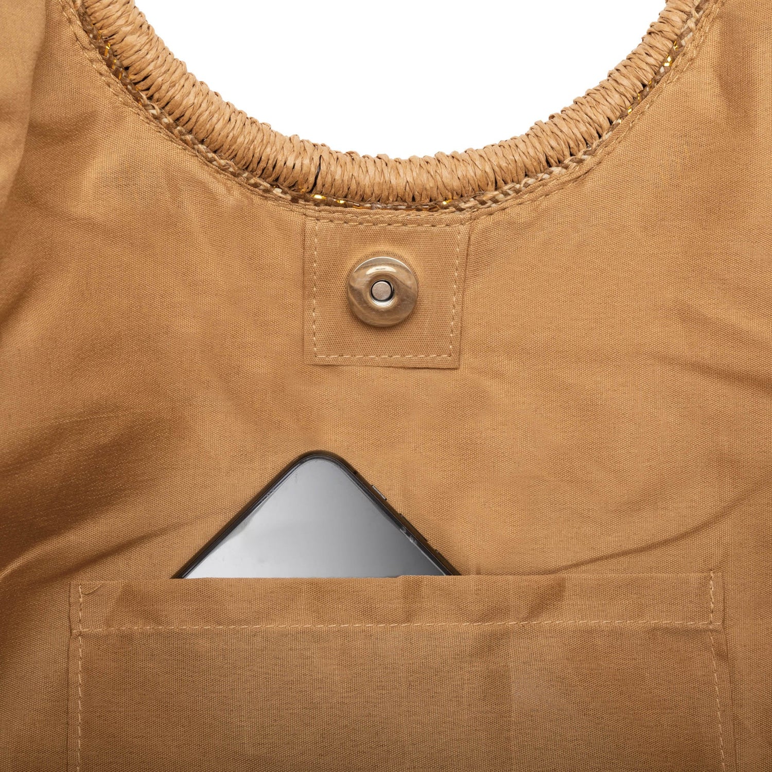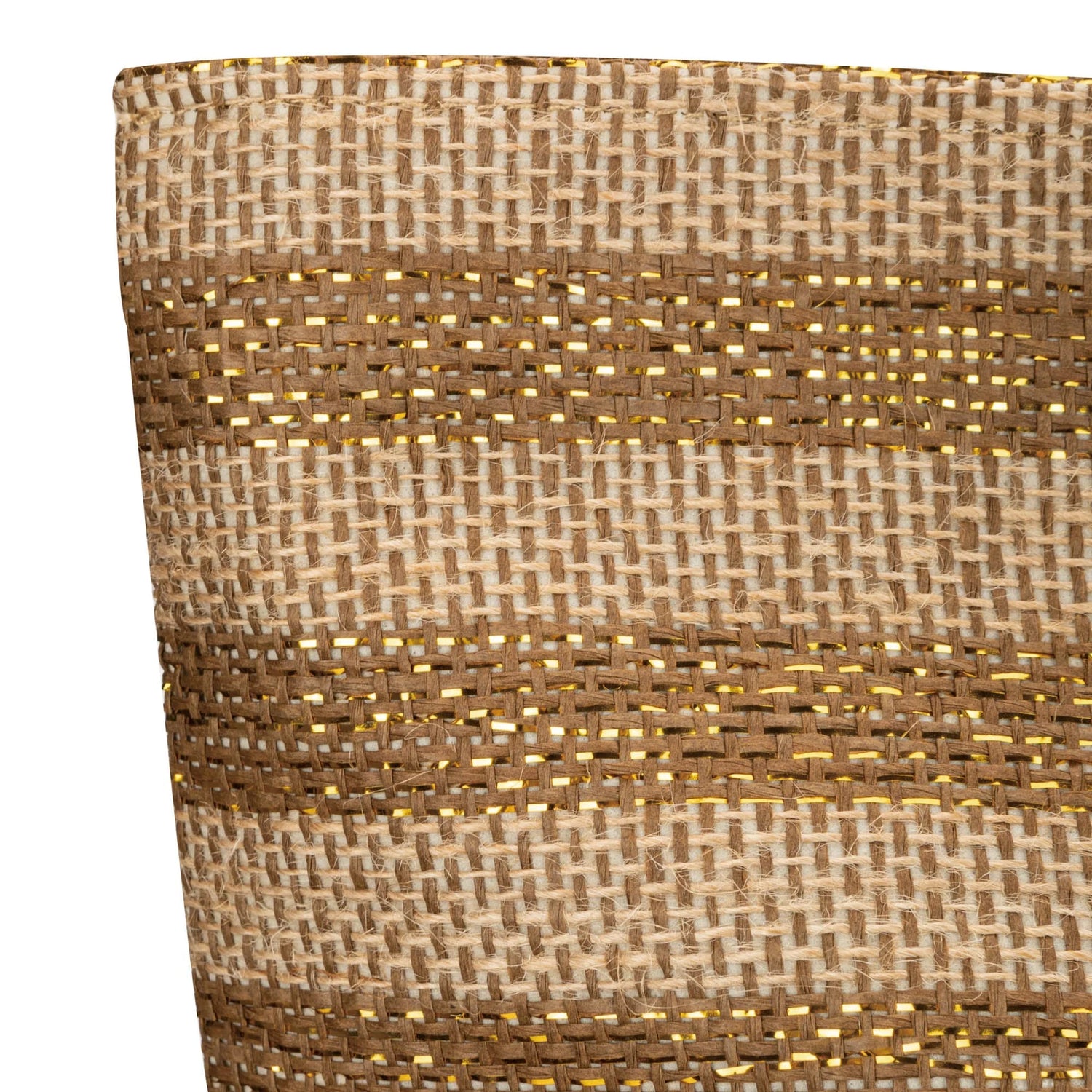 This stylish, natural-colored Meryl Tote Bag is made of high-quality jute and paper for a look that is both modern and timeless. The bag measures 20.5" wide x 7.5" tall x 15" deep, making it spacious enough to carry all your items. Its 6" handle drop provides comfortable, easy transport. To secure your items, the bag has a metal snap closure and cotton lining.