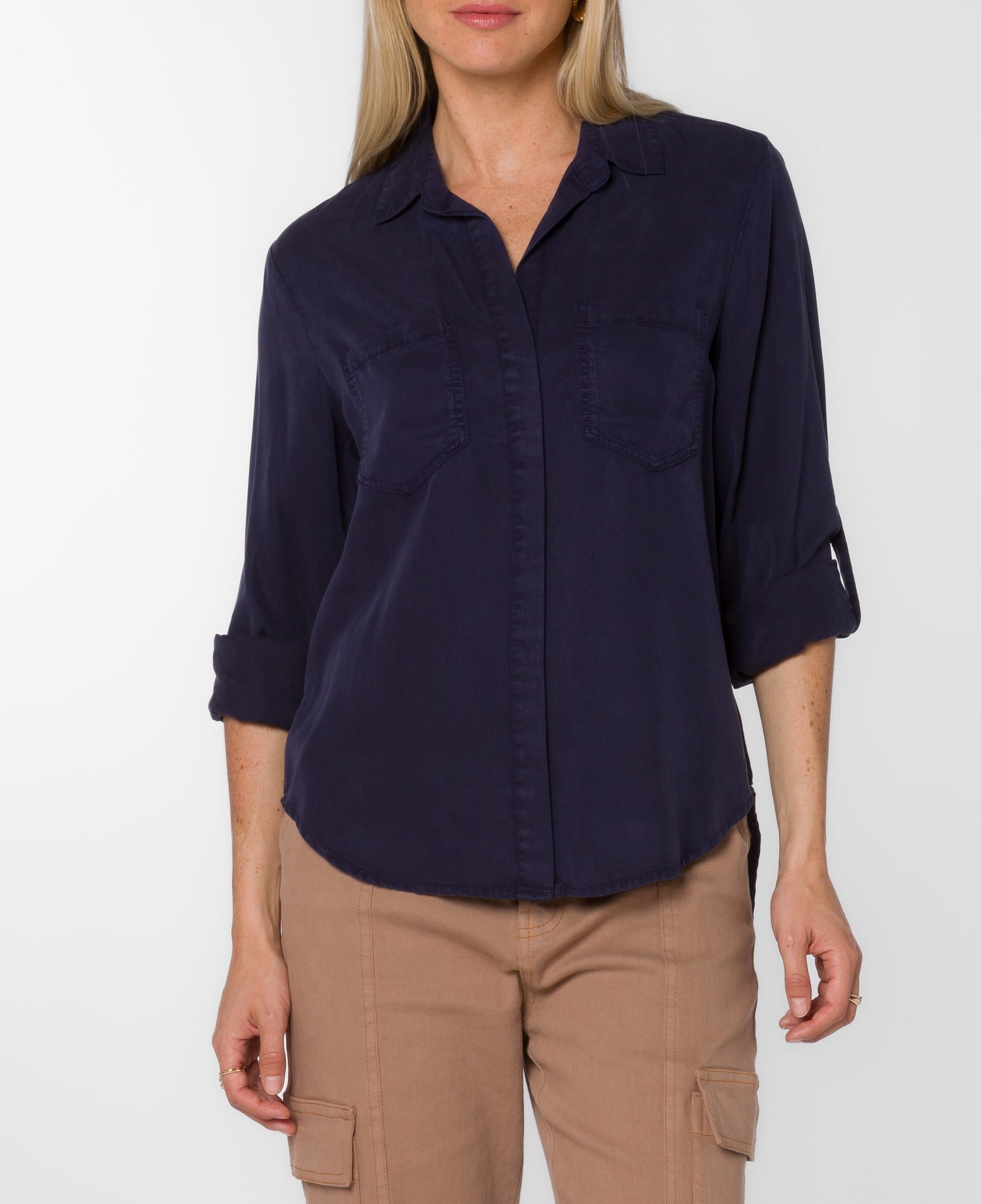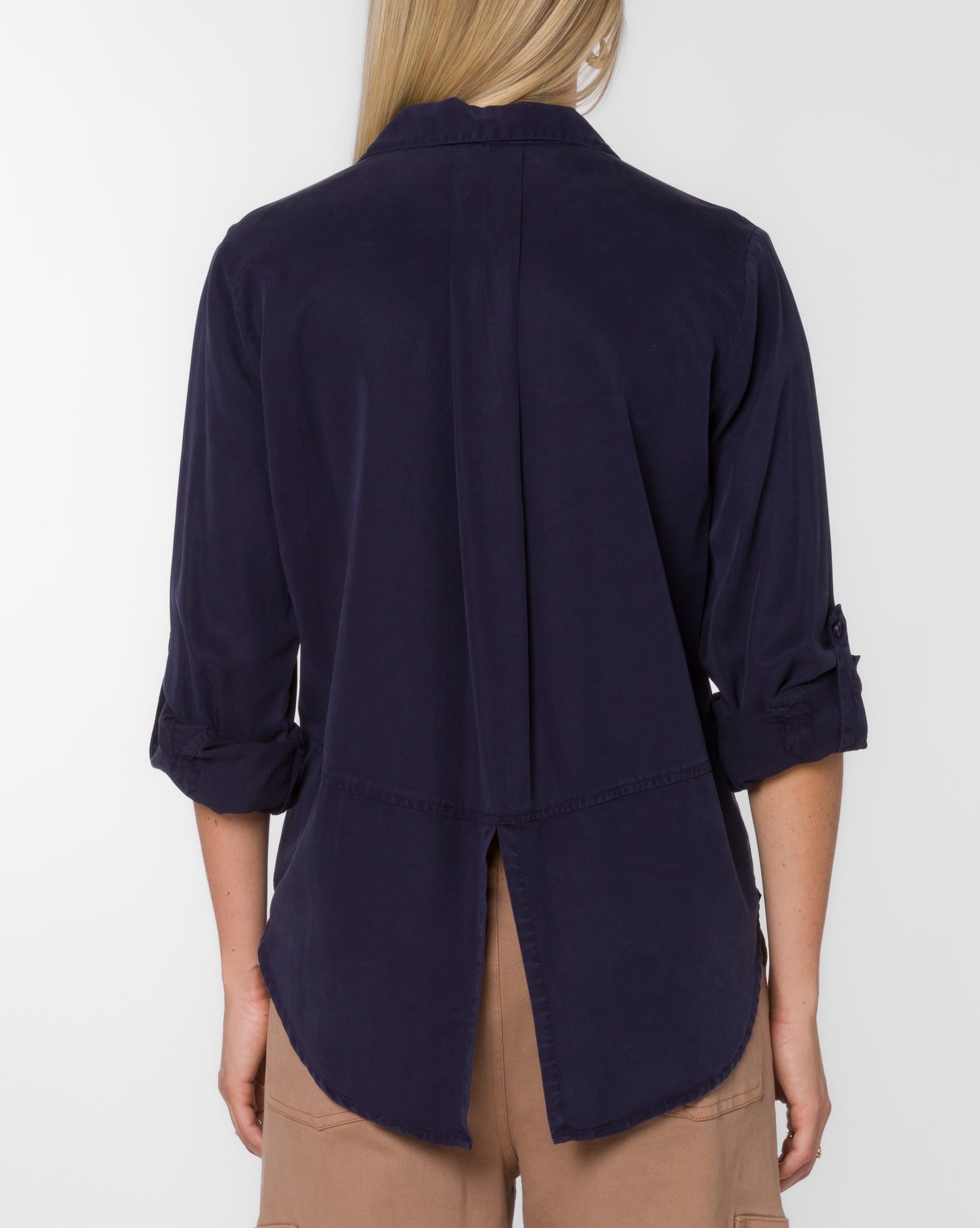 Introducing the Riley Midnight Navy Top, a versatile addition to any wardrobe. Made from eco-friendly 100% Tencel™, this collared button-down shirt features rolled tab sleeves, double chest pockets, a split back tail, and a hi-lo hem. Perfect for any occasion, this top is a must-have staple. Model is 5'9" and wearing a size S. Imported.