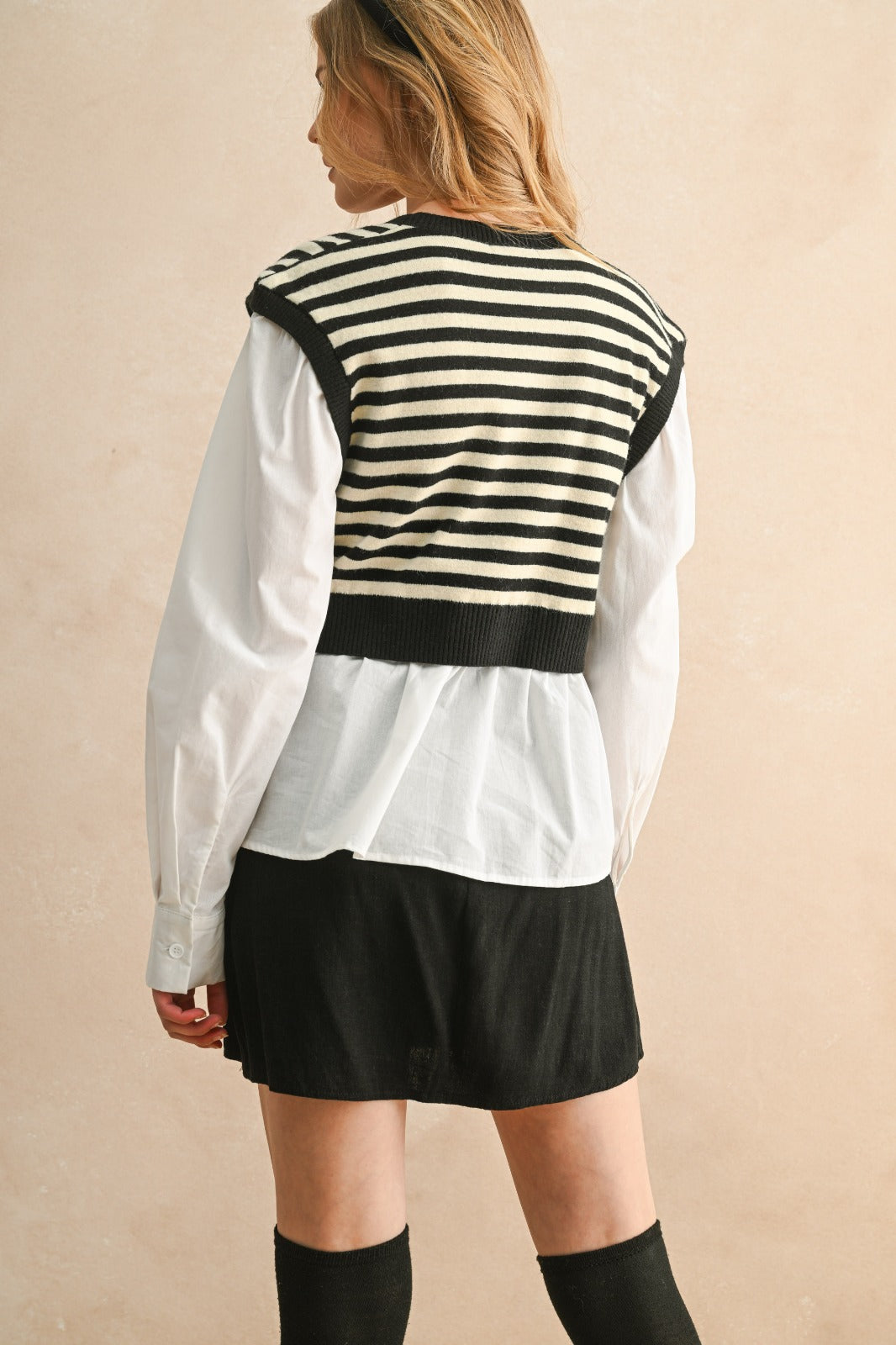 The Colette Sweater combines timeless black and white stripes with a modern layered silhouette for a polished look. Crafted from breathable knit fabric, it offers comfort throughout the day while allowing versatile styling options. Whether dressed up for a chic event or pared down for casual wear, this sweater balances style and ease effortlessly.