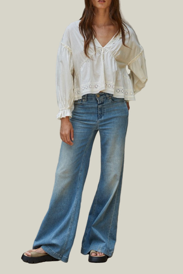 Romantic and refined, this woven Lyocell-cotton blouse is all about timeless details. Featuring a delicate eyelet collar, plunging V-neckline, and button-down front, it’s finished with feminine lace trim for a soft, elevated touch. Perfect for pairing with denim, skirts, or layered under a blazer, this blouse is a versatile piece that effortlessly transitions from day to night.