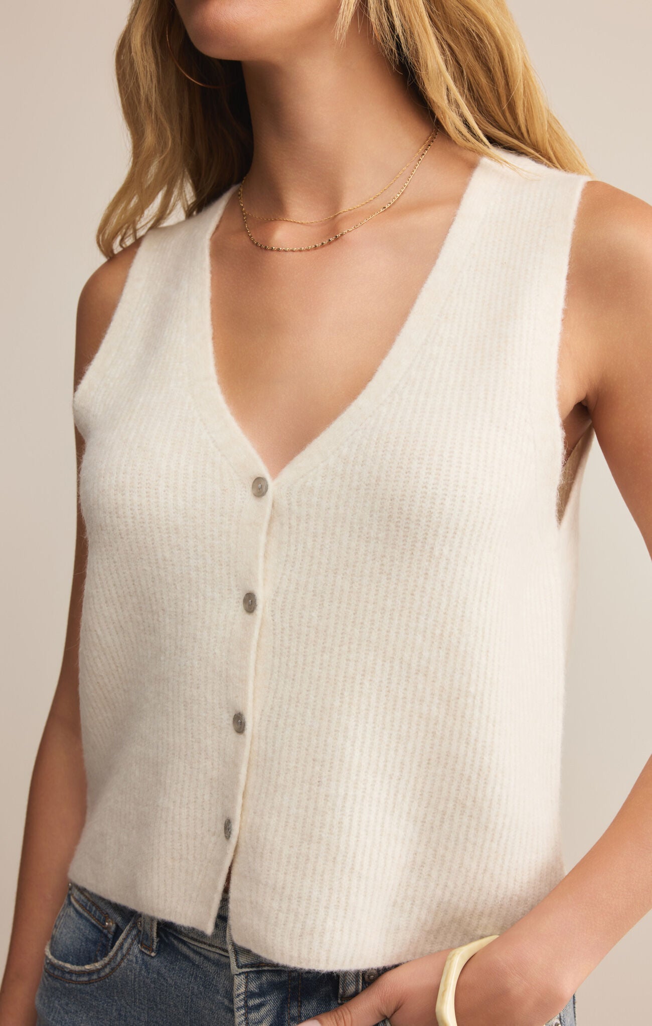 The Z Supply Bryce Sweater Vest in Crystal offers a refined, versatile layering option with its cozy midweight fabric blend of acrylic, nylon, viscose, and spandex. Designed with a flattering V-neck and button-front closure, this sleeveless piece provides a comfortable regular fit. The heavy soft wash enhances softness and durability, while its 19 3/4" length from the shoulder makes it ideal for pairing with various outfits during transitional seasons. Perfect for elevating your spring wardrobe with expert craftsmanship and subtle style.