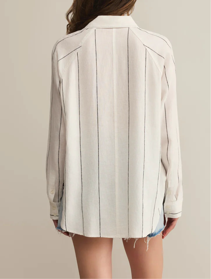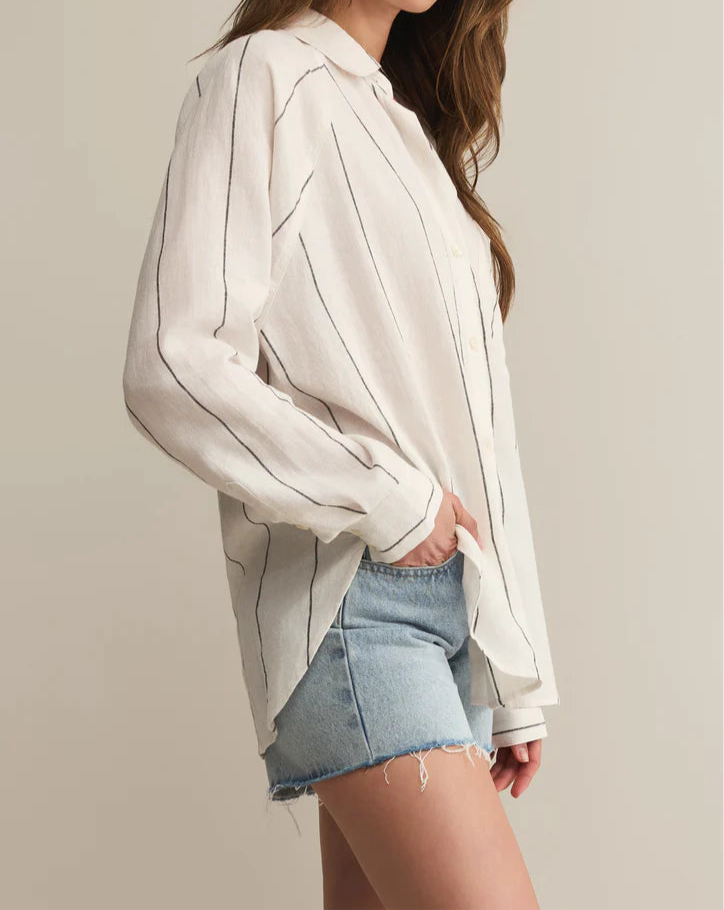 Experience the refined comfort of the Z Supply Perfect Linen Striped Top, crafted for a soft, drapey feel that moves with you. This classic button-up features timeless stripes and a lightweight design, making it ideal for layering or wearing solo. Its breathable fabric ensures all-day ease, perfect for versatile styling from casual outings to relaxed office settings. Elevate your wardrobe with this effortlessly chic essential.